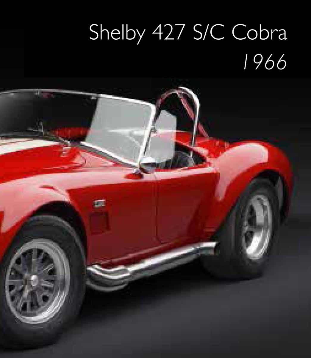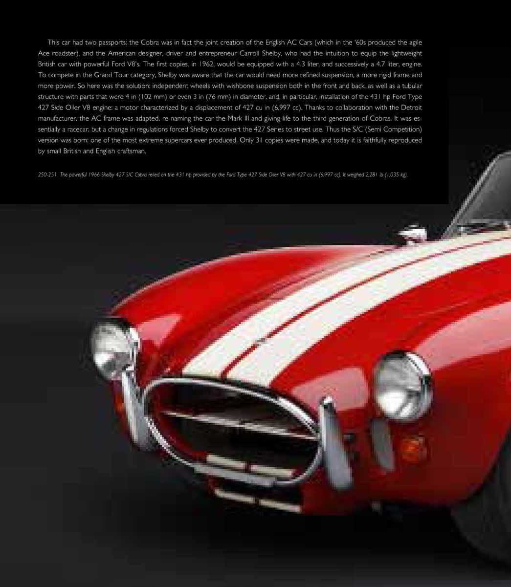 250–251 p. Po galingojo 1966-ųjų laidos modelio „Shelby 427 S/C Cobra“ gaubtu slypėjo V8 tipo variklis „Ford Type 427 Side Oiler“, galintis išvystyti 431 AG. Motoro darbinis tūris siekė 6997 cm3. Automobilis svėrė 1035 kilogramus.