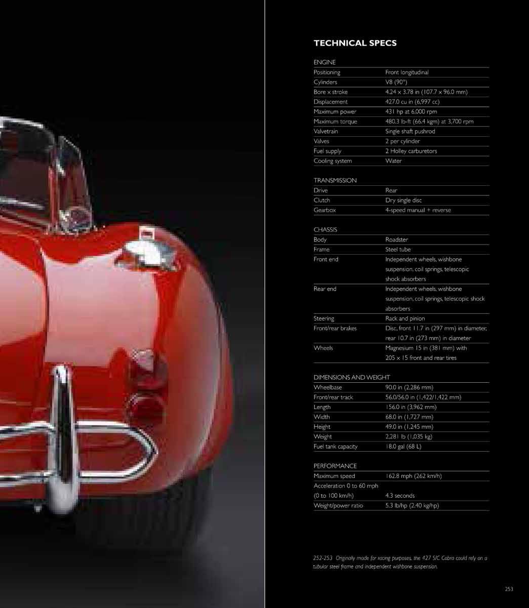 252–253 p. Iš pradžių lenktynėms sukurto modelio versija „427 S/C Cobra“ turėjo iš plieno vamzdžių suvirintą rėmą ir pakabas su trikampėmis svirtimis.