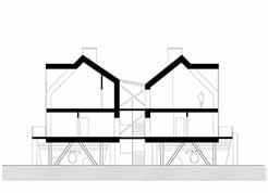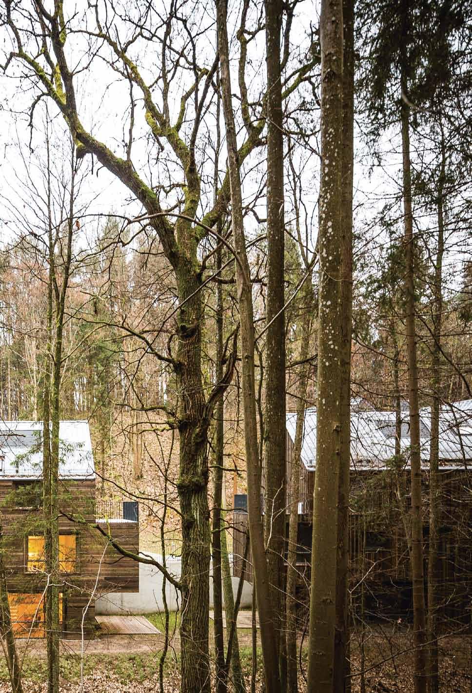 Each site poses its own challenges. In one of them – Pavilnių Regional Park, a for mer military and warehouse area – we started designing *the* Rasų Houses back in 2006. According to the detailed plan of the area, construction was only allowed on specific narrow sections of the site. Considering this circumstance and the client’s desire to create as much saleable area as possible, we outlined the neighbourhood’s identity: the slightly odd proportions, similar to those of a nesting box, of the lower houses and the houses overhanging the entrances of the Polish army’s former am munition storage facilities; the articulation of the façade of these houses being in spired by the traditional timber architecture of Vilnius’s outskirts. This idea, entitled “raised + lowered”, allowed the inhabitants to avoid unwanted visual interactions with neighbours and to open up the houses on the wooded northern slope to daylight by chamfering the window reveals.