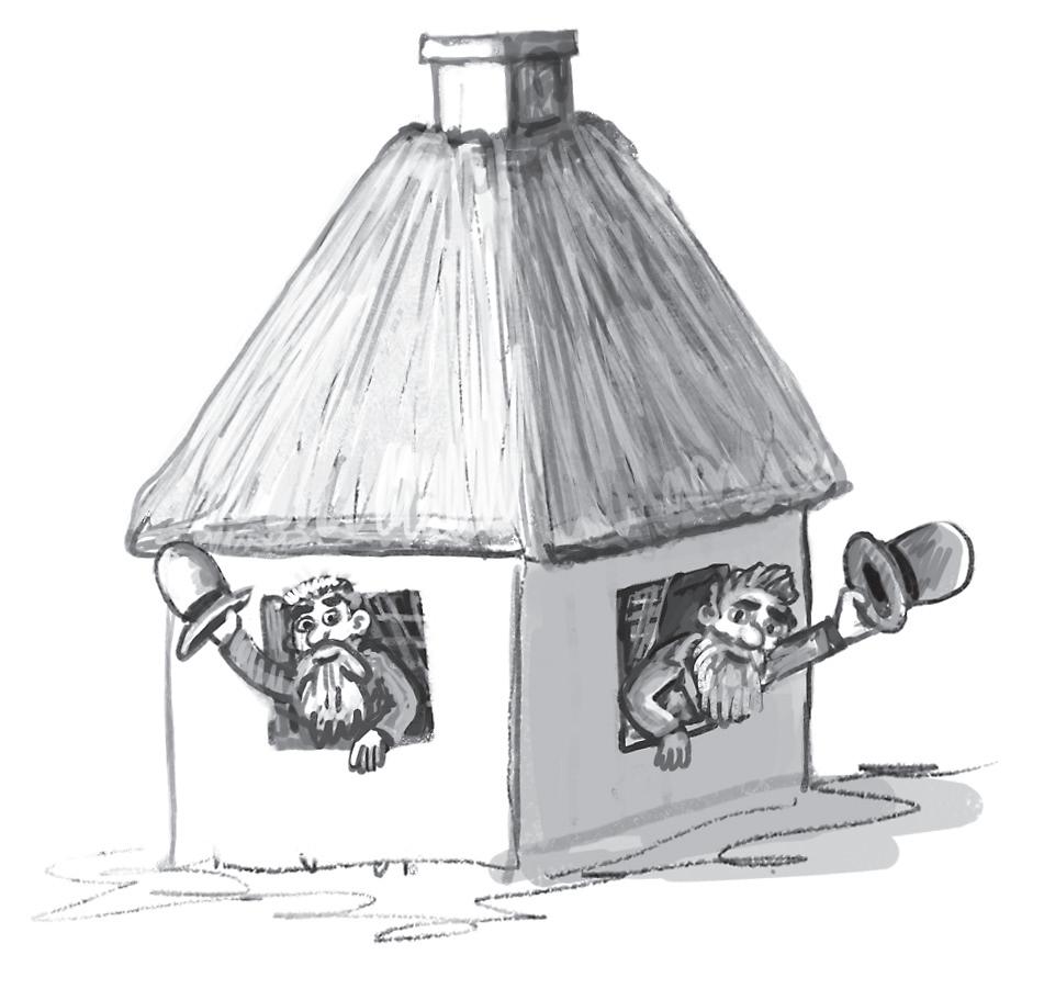 – Tebūnie šviesa, – sukuždėjau į tamsą. Ir magiška šviesa iškart nušvietė milžinišką salę, kurioje buvo apžiūrų kampelis ir daugybė gyvenamųjų skyrelių. Priėjus samanomis ir viržiais apaugusį kampelį mus pasveikino džiugūs šūksniai. Iš namukų kyščiojo galveles žaliai apsitaisę žmogeliukai ir mojavo mums skrybėlėmis.