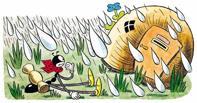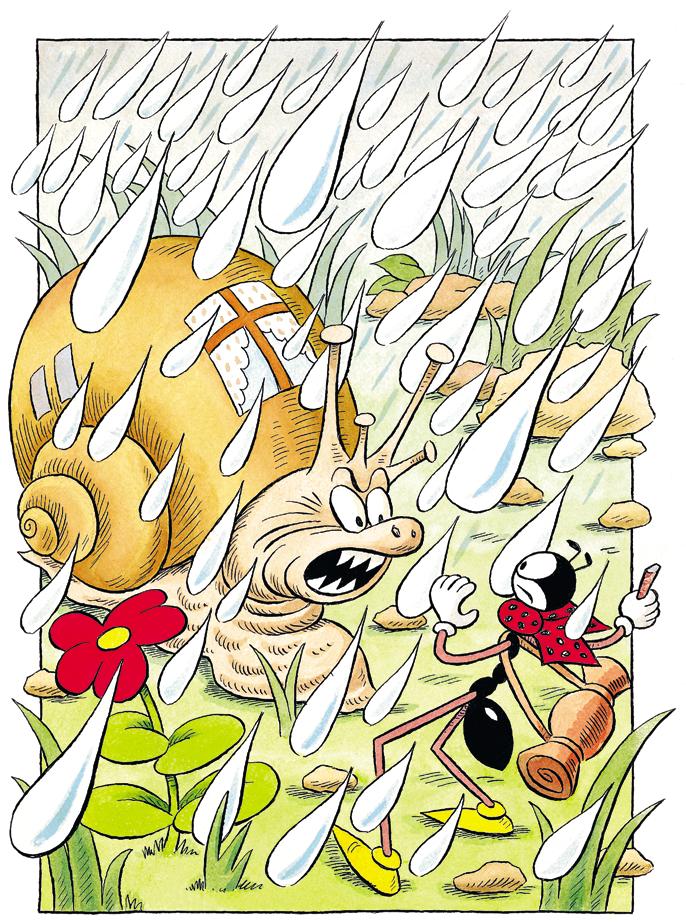 Ji dar norėjo pasakyti Skruzdėliukui: „Tu, purvina bjaurybe!“ Bet vos tik pravėrė burną, kaptelėjo toks didelis lietaus lašas, kad ji užsikosėjo, įtraukė galvą į namelį ir daugiau nebepasirodė.
