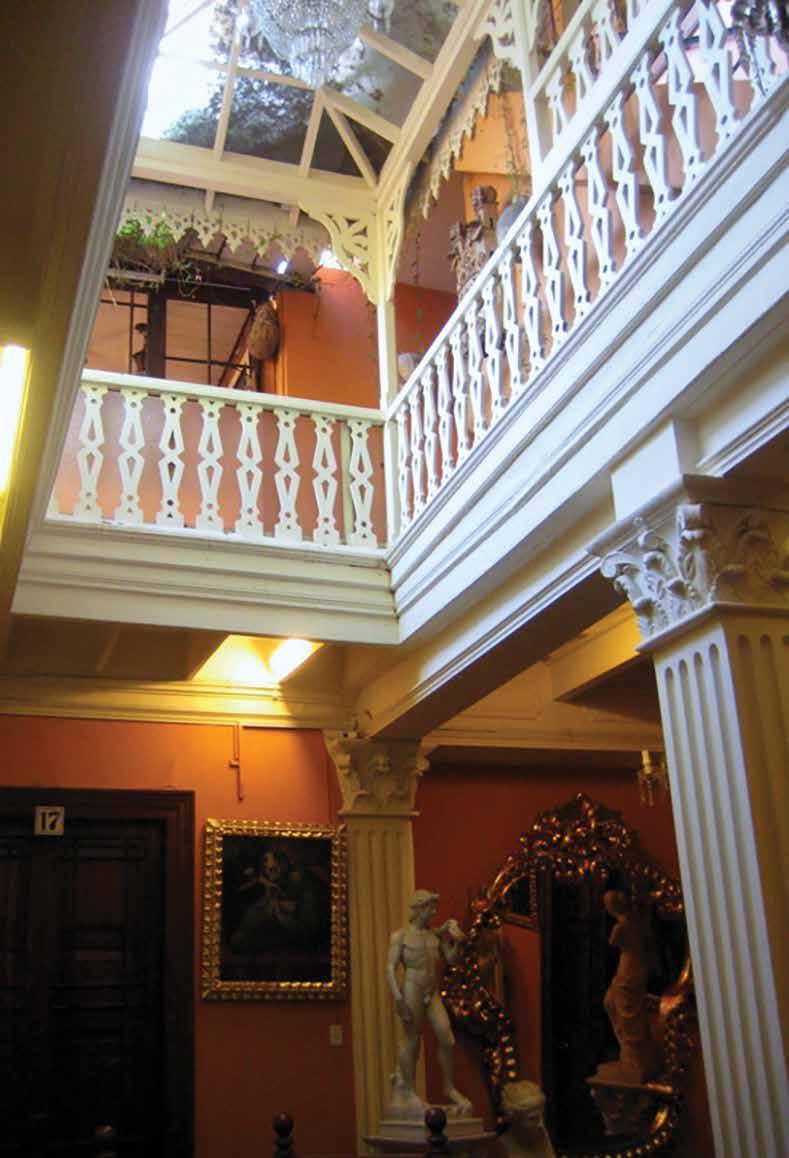 taip pat sunkiuose, įmantriuose rėmuose, – kažkodėl kabančių beveik palubėje ir praktiškai neatliekančių savo funkcijos – nė viename, net pasistiebus ant pirštų galiukų, pamatyti savo atvaizdo nepasisekė. O kur dar gausybė gipsinių skulptūrų, tarp kurių jau per pirmas kelias minutes nustebusios akys aptinka bent šešis Mikelandželo Dovydus. Tikra dovydomanija... Ant plačių ir aukštų dvivėrių kiekvieno kambario durų, su langu viršuje žvelgiančių į koridorių, vietoje mums įprastų užraktų kabo masyvios geležinės spynos, o ilgame koridoriuje už geležinių, spyna užrakintų grotų smagiai nuteikia „seifas“ – mediniai stalčiukai su prie kiekvieno kabančiomis parūdijusiomis spynomis. Sunku suskaičiuoti, kiek aukštų turi dvarelis – erdvus, aukštas centrinis holas atviras per juos visus, taigi iš pirmojo aukšto matyti lyg ir trys ratu aplink holą besisukantys aukštai. Pačiame viršuje – stiklinis stogas, dengiantis tik holą, o jo šonuose šviečia kraštelis atviro dangaus. Kaip kokie sąmokslininkai –patenkinti, neįstengdami paslėpti šypsenų ir nuostabos vis susižvalgome tarpusavyje. Čia tai bent...