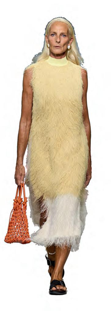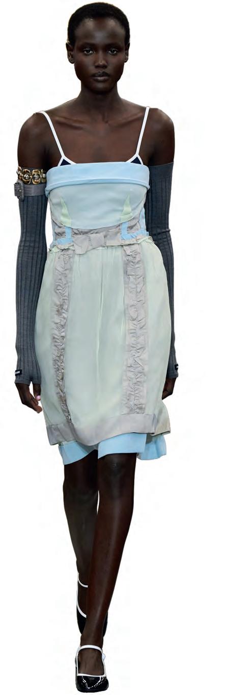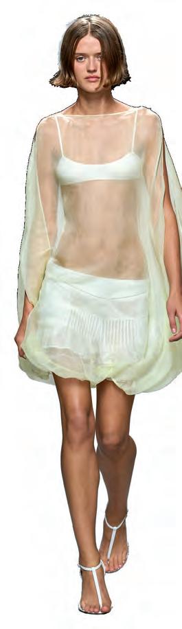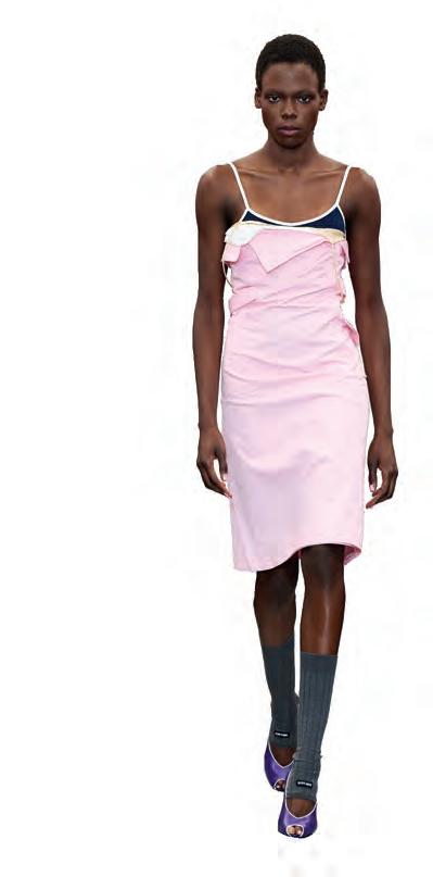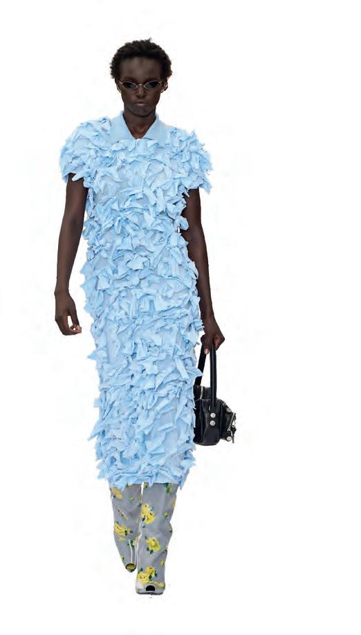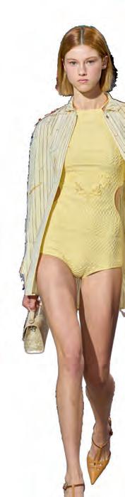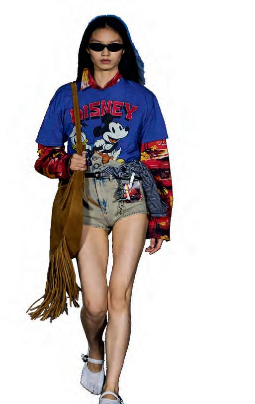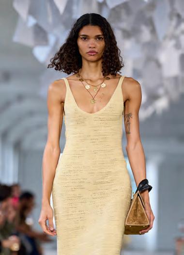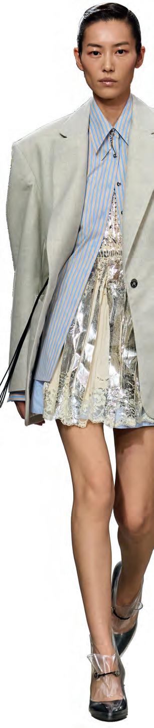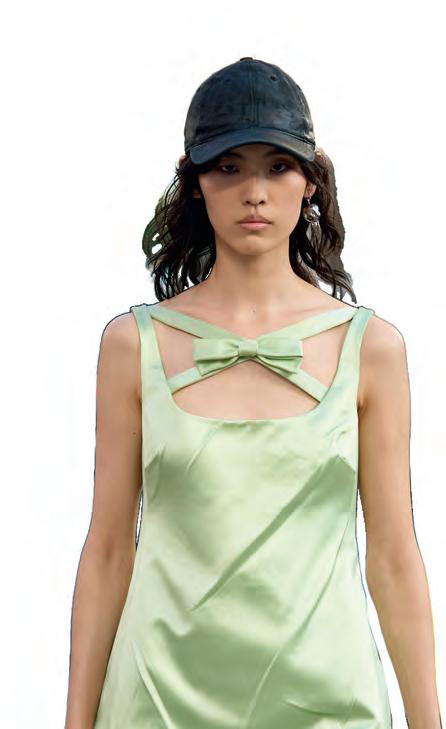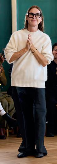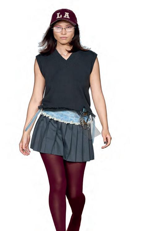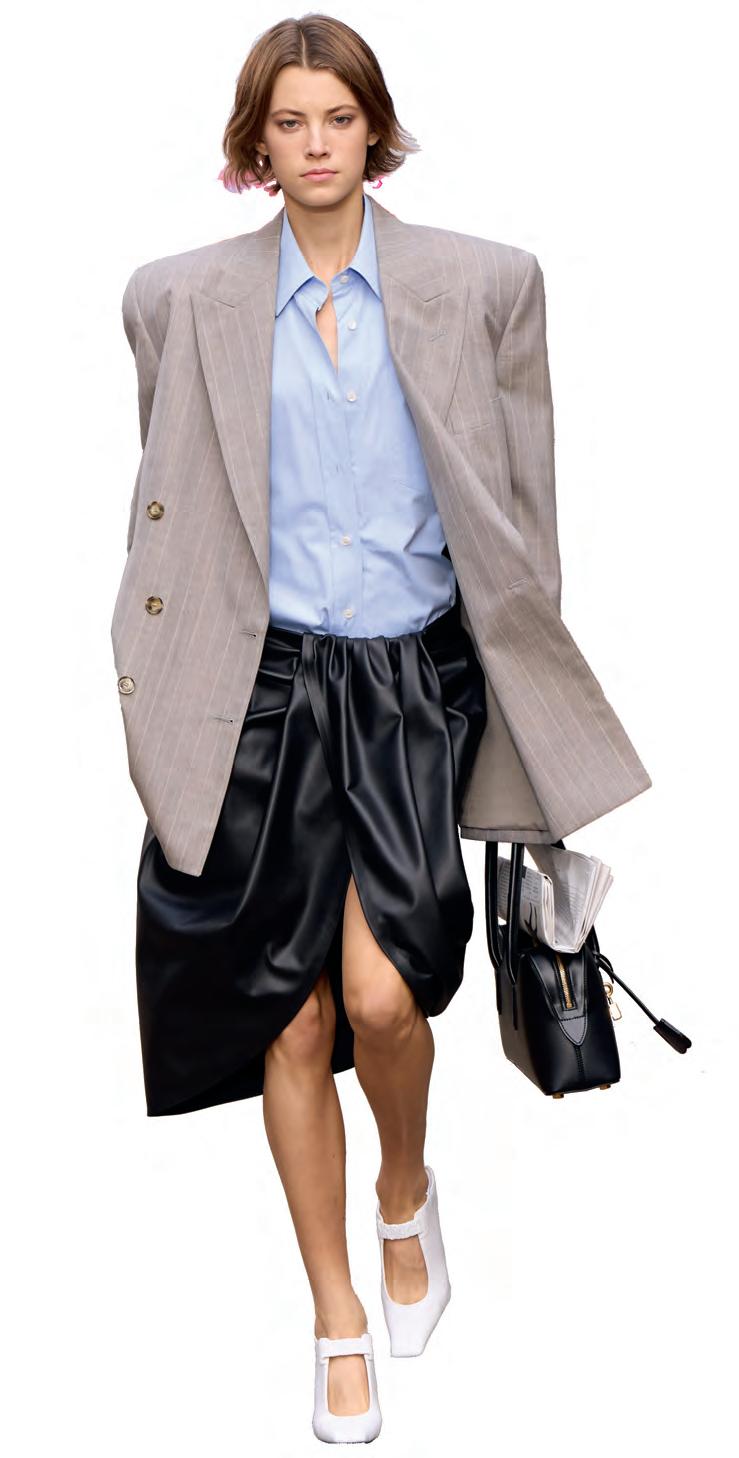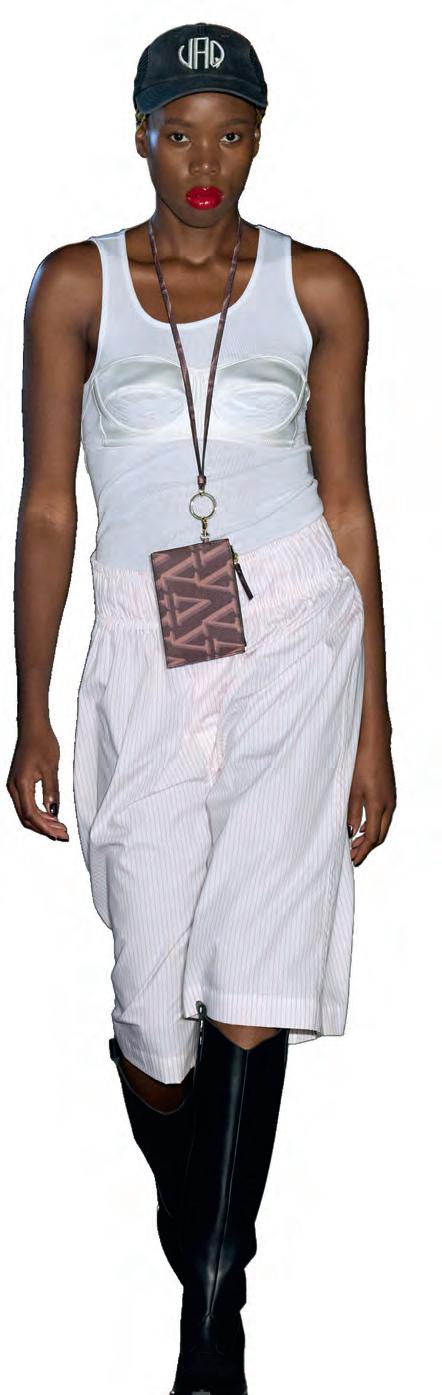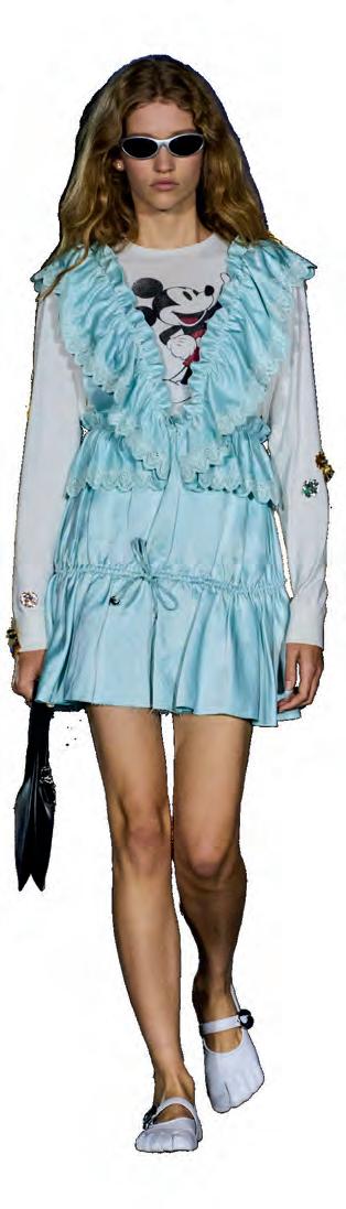 FOR MIU MIU’S SPRING/SUMMER 2025 SHOW, Polish artist Goshka Macuga transformed Paris’ Palais d’Iéna into a makeshift printing plant, complete with newspapers whirling above on conveyor belts. Dubbed The Truthless Times, the fictional publication featured a QR code linking to “We’re in the Endcore Now,” an essay by Shumon Basar. In it, the British author muses on the disorientation of our era: constant dizzying change, blurring boundaries between fact and fiction (real deal or AI deepfake?) and a persistent, gnawing feeling that the end is near but not quite here yet—and so we wait. Amid all the doom and gloom, Miuccia Prada offered reassurance in the form of a collection celebrating singularity and self-expression. (Because when nothing feels real anymore, what’s realer than being your true self?) The whole thing read as a cheerful jumble of shiny fabrics, punchy hits of colour and irreverent mash-ups: a sporty swimsuit paired with a pleated skirt and knee-high socks, Western belts slung low over a diner-waitress-esque dress. It was chaotic in the best sense—fun and unserious rather than unsettling. As the house expressed, “Miu Miu continues to build its world of diverse and fierce individuals, true characters inhabiting its clothes.” The show’s casting couldn’t have better personified the ethos, with creatives such as actors Willem Dafoe (who closed the show) and Hilary Swank, Canadian singer-songwriter Charlotte Cardin, rapper Little Simz and fashion icons Alexa Chung and Cara Delevingne all “walk[ing] in their own truth,” as the brand put it. In a world where trend cycles spin out at an exhausting speed and TikTok “-cores” perpetuate a sea of sameness, Ms. Prada leads us back to solid sartorial ground, encouraging us to block out the noise and simply dress from the heart.