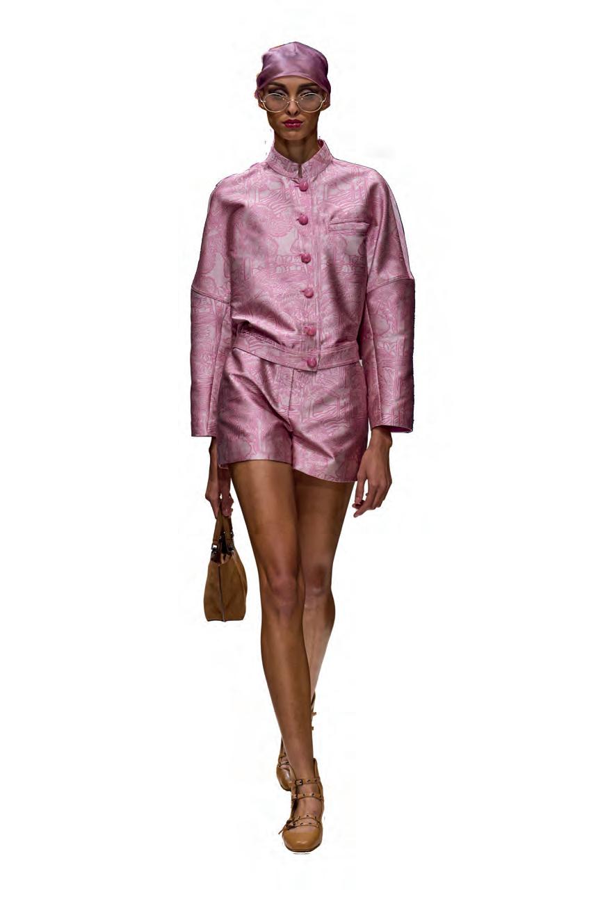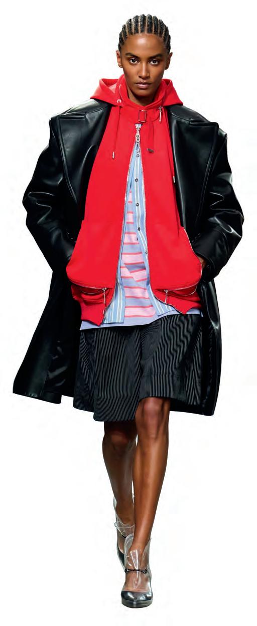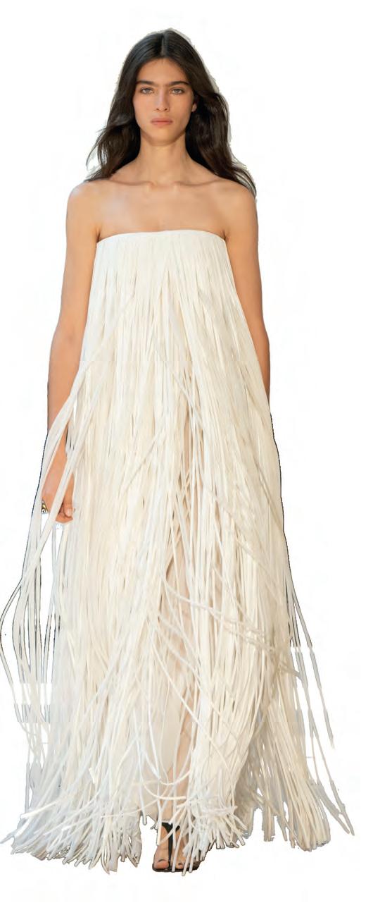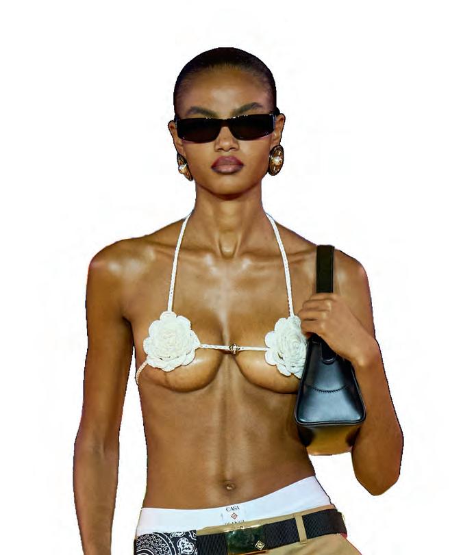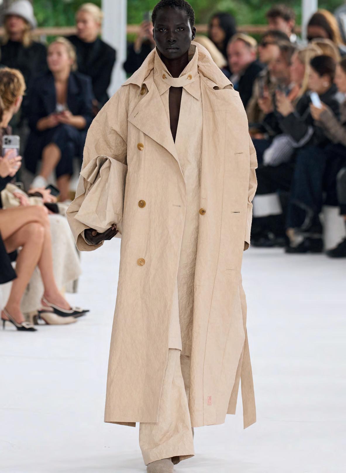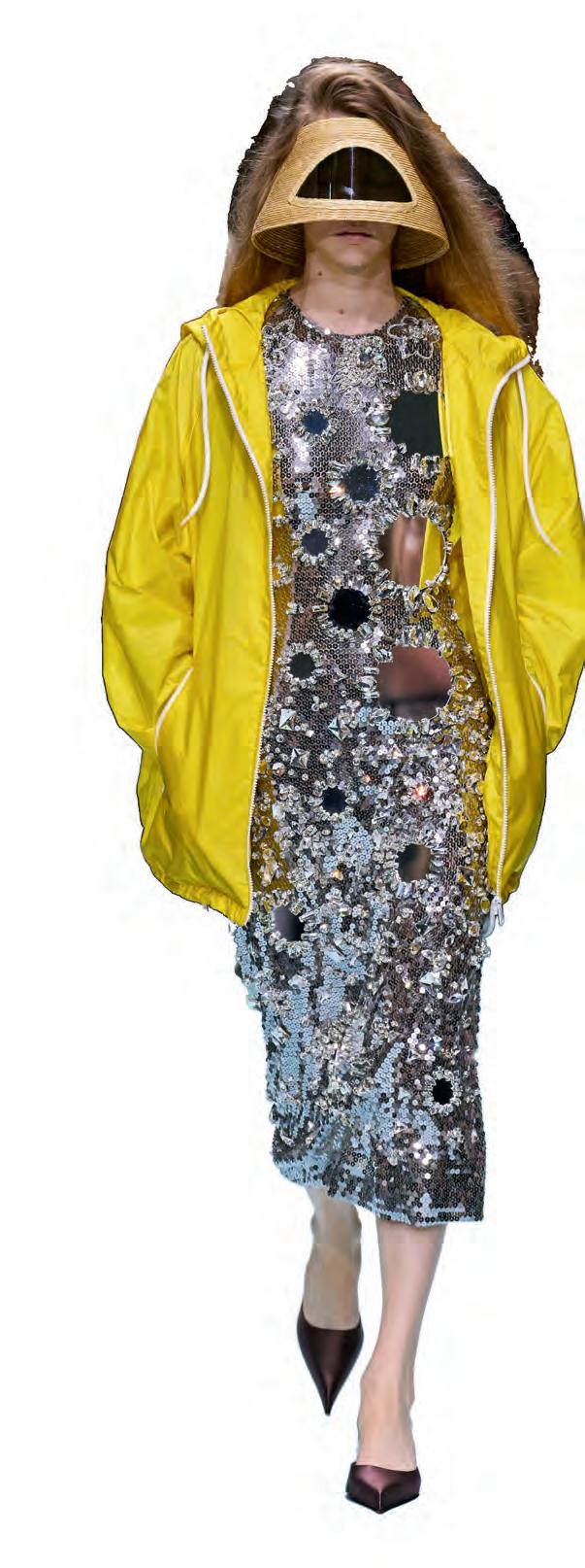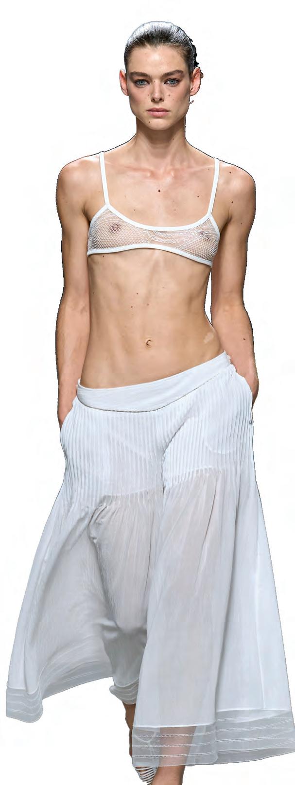 FOR MIU MIU’S SPRING/SUMMER 2025 SHOW, Polish artist Goshka Macuga transformed Paris’ Palais d’Iéna into a makeshift printing plant, complete with newspapers whirling above on conveyor belts. Dubbed The Truthless Times, the fictional publication featured a QR code linking to “We’re in the Endcore Now,” an essay by Shumon Basar. In it, the British author muses on the disorientation of our era: constant dizzying change, blurring boundaries between fact and fiction (real deal or AI deepfake?) and a persistent, gnawing feeling that the end is near but not quite here yet—and so we wait. Amid all the doom and gloom, Miuccia Prada offered reassurance in the form of a collection celebrating singularity and self-expression. (Because when nothing feels real anymore, what’s realer than being your true self?) The whole thing read as a cheerful jumble of shiny fabrics, punchy hits of colour and irreverent mash-ups: a sporty swimsuit paired with a pleated skirt and knee-high socks, Western belts slung low over a diner-waitress-esque dress. It was chaotic in the best sense—fun and unserious rather than unsettling. As the house expressed, “Miu Miu continues to build its world of diverse and fierce individuals, true characters inhabiting its clothes.” The show’s casting couldn’t have better personified the ethos, with creatives such as actors Willem Dafoe (who closed the show) and Hilary Swank, Canadian singer-songwriter Charlotte Cardin, rapper Little Simz and fashion icons Alexa Chung and Cara Delevingne all “walk[ing] in their own truth,” as the brand put it. In a world where trend cycles spin out at an exhausting speed and TikTok “-cores” perpetuate a sea of sameness, Ms. Prada leads us back to solid sartorial ground, encouraging us to block out the noise and simply dress from the heart.
