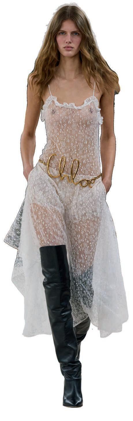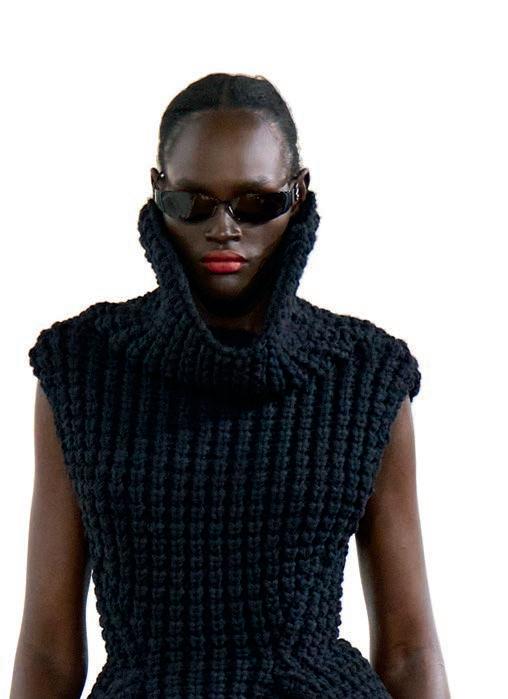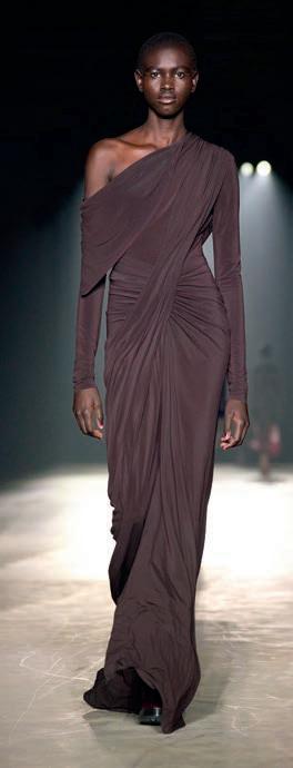 IT’S RARE TO FIND A SINGULAR , unwavering point of view in today’s trend-chasing environment, and that’s just one of the reasons why we love Rick Owens. Known for his post-apocalyptic, goth-grunge aesthetic, Owens consistently creates a fantasy universe that challenges conventional notions of power and sensuality. For the presentation of Hollywood, his spring/summer 2025 menswear collection, Owens returned to the infamous “boulevard of vice,” where his formative years were spent, and paid homage to the “weirdos and freaks” he’d encountered on the notorious Los Angeles strip. The result was nothing short of cinematic. There were only 10 all-white looks in this collection, but each was repeated 20 times on a total of 200 models, who walked through Paris’ Palais de Tokyo courtyard to Beethoven’s Symphony No. 7 Allegretto. The grandeur of the presentation called to mind a Cecil B. DeMille epic, particularly when a trio of acrobats waving a flag symbolizing unity were carried on a litter. With its thigh-high Kiss platform boots, boxer shorts, flowing capes and knits by Slovenian designer Tanja Vidic, Hollywood has all the makings of a quintessential Rick Owens collection. According to the creative director, the return to showing at the Palais de Tokyo following last season’s intimate presentation at his own home in Paris represented an expression of inclusivity. His vision was further augmented by the show’s models—mainly fashion students who’d answered an open casting call. In the collection notes, Owens wrote that “expressing our individuality is fine but, sometimes, manifesting our unity and our need to rely on one another is also a very good thing. Especially when we are witnessing a dramatic escalation of intolerance in the world right now.”