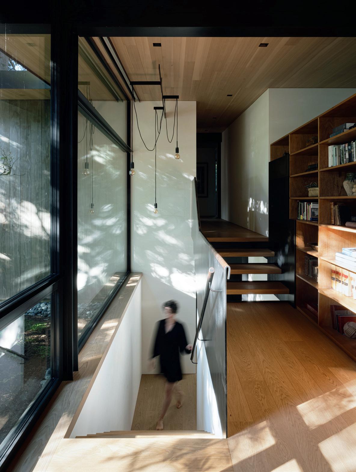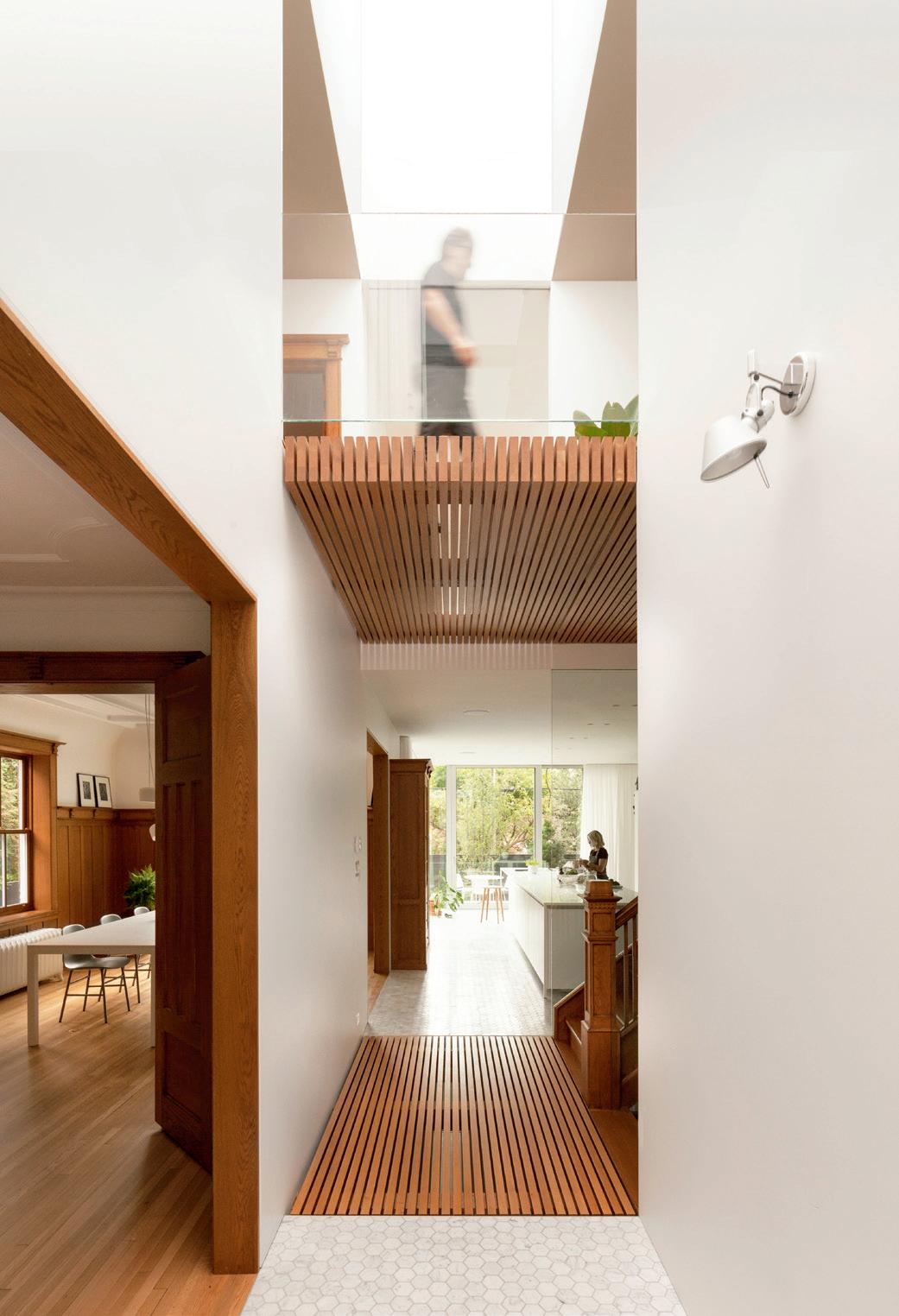 A rectangular opening in the roof allows natural light to travel through the hallways and wooden latticework to reach the ground floor. A Tolomeo wall light from Artemide (artemide.com) takes over in the evening. Hexagonal Italian marble tiling in the kitchen and hallway (ramacierisoligo.com) serves as a contrast to the omnipresent red oak.