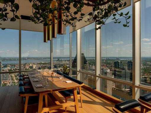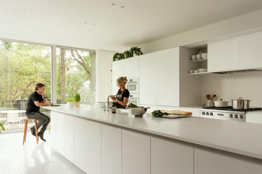 The streamlined custom kitchen, designed by La Shed, was built around a slender island topped with Corian (corian.com). It is accented by C401 stools from Kastella (kastella.ca). Miele appliances (miele.ca).