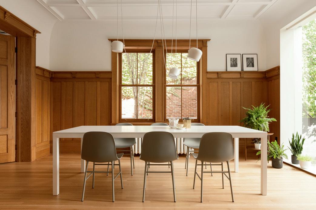 Opposite page — Throughout the home, the original woodwork has been restored. In the dining room, a large window with a hidden frame (shallwin.ca) topped by a vaulted ceiling with ornamental coffers, gives the room a contemporary feel. It is complemented by a minimal amount of furniture: the Aim light fixture by the Bouroullec brothers for Flos (flos.com), a custommade table and six Form chairs from Normann Copenhagen (normann-copenhagen.com).