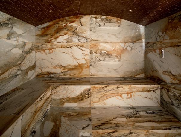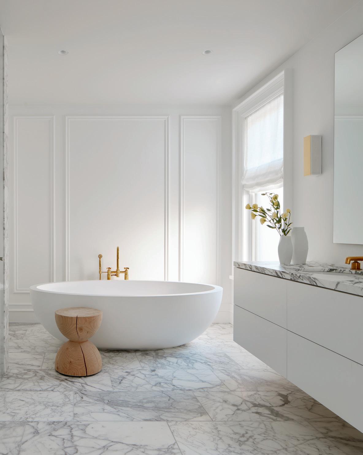 This very tone-on-tone bathroom shows its colours in small flourishes, thus highlighting the gold-finish Henry faucets (waterworks.com). Clessidra stool (riva1920.it). Line V sconces (ozonelight.com)