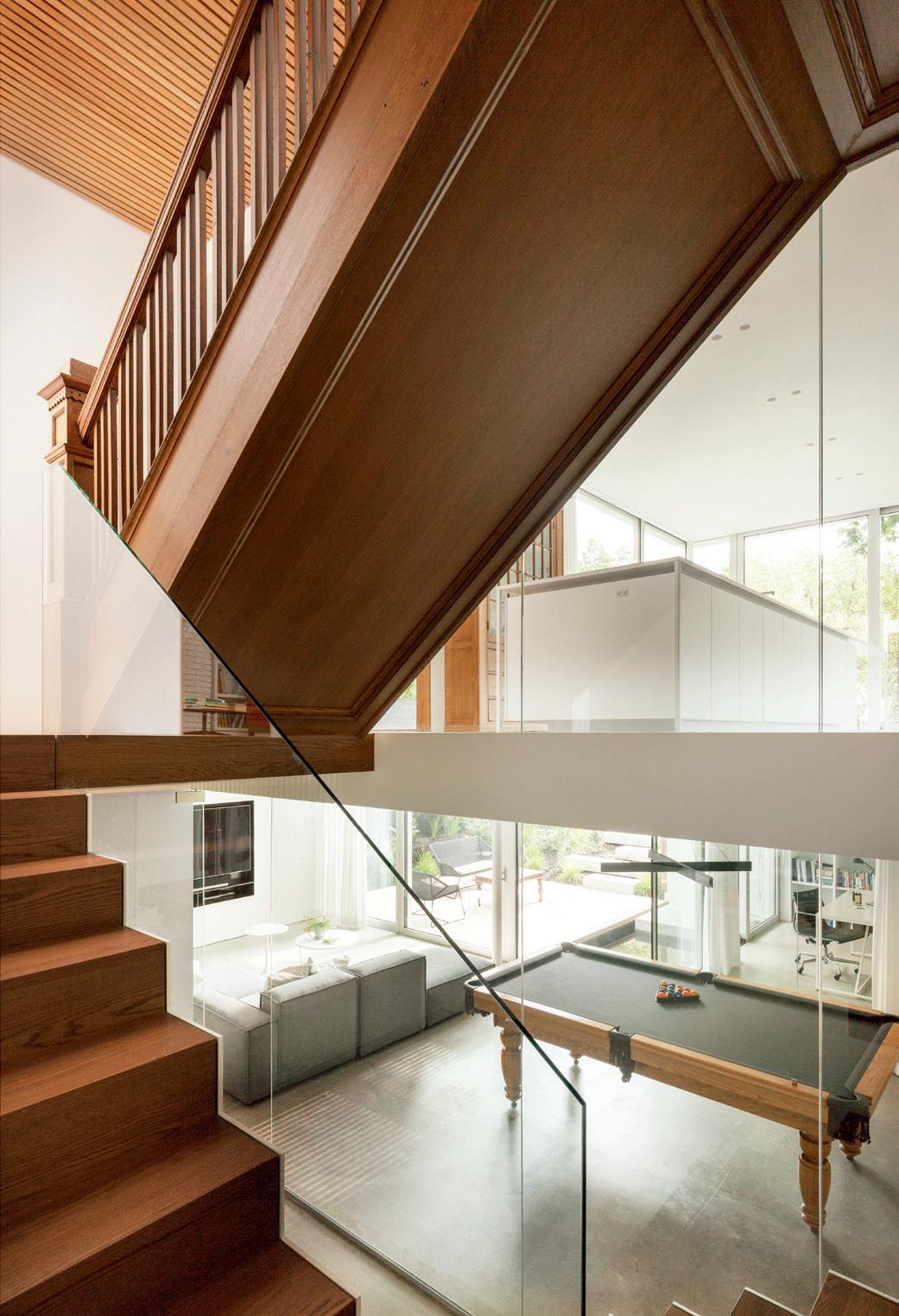 In the entryway, the photograph Vue sur Tokyo by Maxime Brouillet (maximebrouillet.com) Opposite page — The original staircase, which was formerly partitioned, was dismantled, rebuilt and lined with glass panels so that its beauty becomes continuous.
