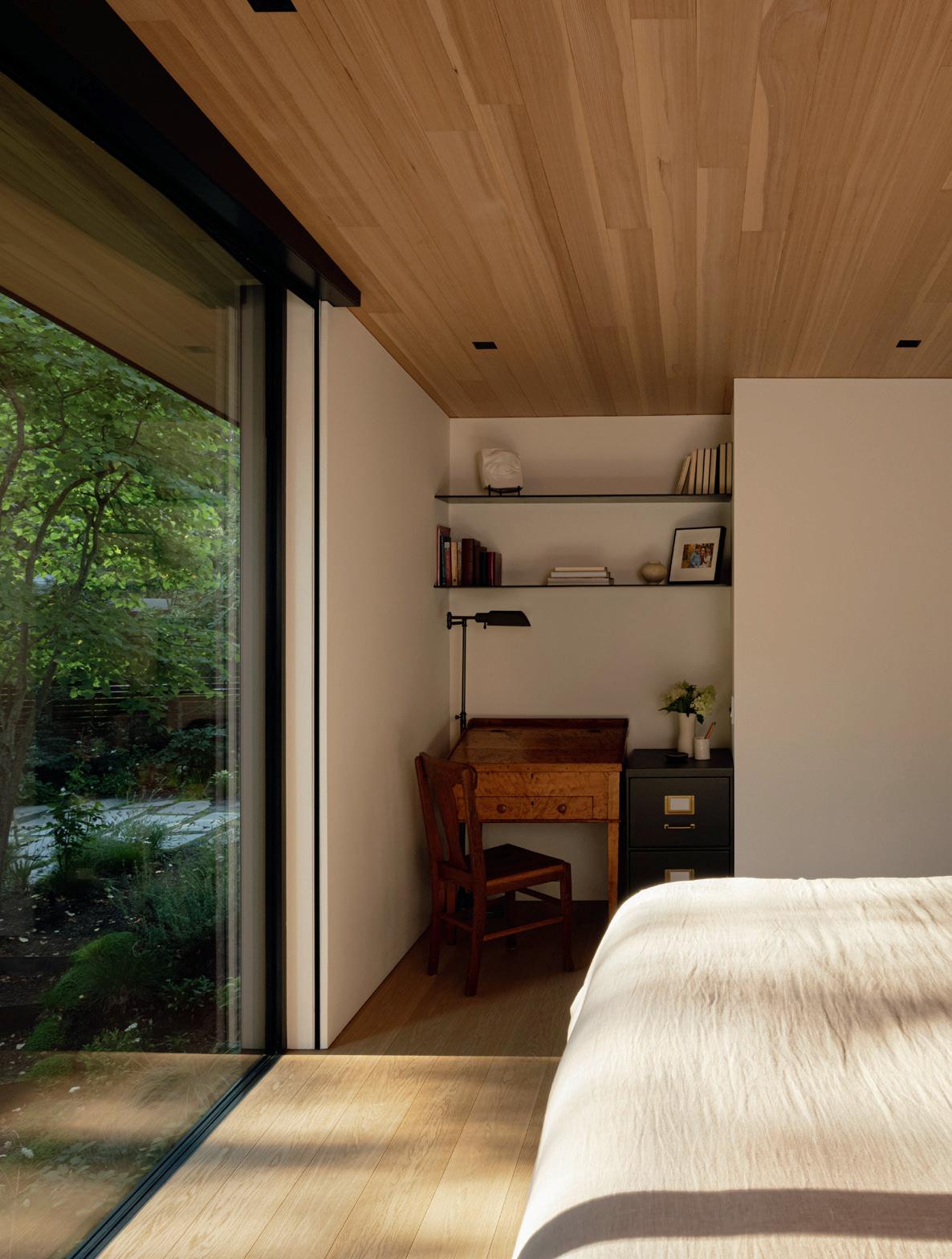 “In NDG, semi-detached houses often have raised wooden appendages in the backyard with a deck underneath. They usually have a basic shape with a double-pitched roof. It was an interpretation of this element that created the space that now contains the master bedroom.”