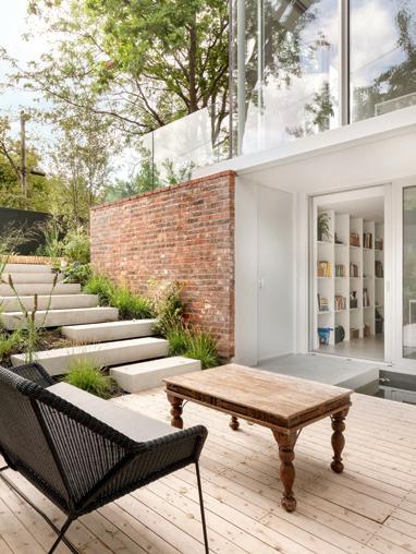 The garden level, once sombre, is now bright and closed off from the neighbourhood. It is bathed in the reflections coming off the decorative pond. Next to the custom-made bookcase are the Domino sofa by Montreal company Romano (romanosofa.com), a side table from Blu Dot (bludot.com) and Eero Saarinen’s Tulip table (knoll.com). Danish Breeze outdoor furniture (cane-line.ca).