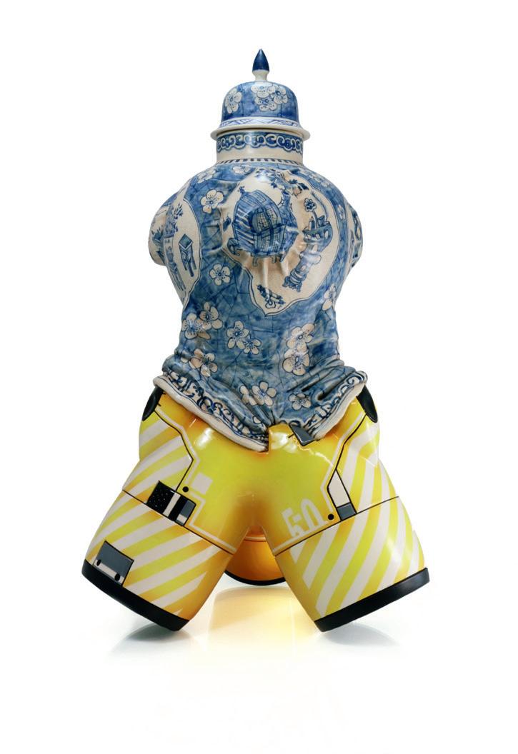 This piece, entitled 5.0-S (or Tripod for short), is the work of Brendan Lee Satish Tang, a Canadian artist of mixed Asian descent. It’s a part of his Manga Ormulu sculpture series, which fuses contemporary pop culture—in this case an imaginary manga character—with icons of the Asian tradition. With his powerful yet playful creations, Tang explores their contradictory and complementary strengths. — (brendantang.com) (c24gallery.com) (galleryjones.com)