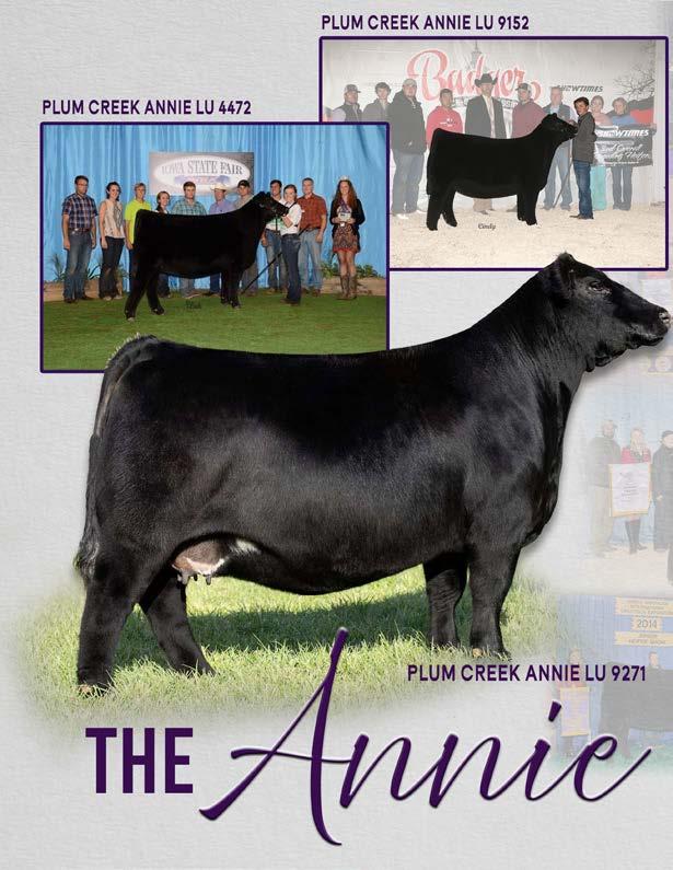 When the Annie Lu cow family started right here in Algona, IA, we could never have imagined the impact it would have on our program and others across the country. The original S H Miss Annie Lu 6087 shaped our breeding program by producing the building blocks such as Plum Creek Paradox 161B, Plum Creek Annie Lu 4472, and Plum Creek Miss Annie Lu 361C. The third generation of females is now producing at an elite level, and leading the charge is Plum Creek Annie Lu 9271, the dam of Plum Creek Annie Lu 5230. While there is no rhyme or reason to this year’s sale order, it is only fitting to lead off with a fourth-generation daughter that embodies everything the Annie Lu’s are known for. From the ground up, she is constructed flawlessly. She carries herself with such ease and poise while showcasing the elegant look we’ve come to expect from Annie Lu’s. With her deep center body and a genuine muscle pattern, 5230’s best days are still to come. Her full sisters have hung some of the most prestigious banners in the country, but we firmly believe this female is up to the task and will continue to raise the standard for generations to come. X Plum Creek Annie Lu 9271
