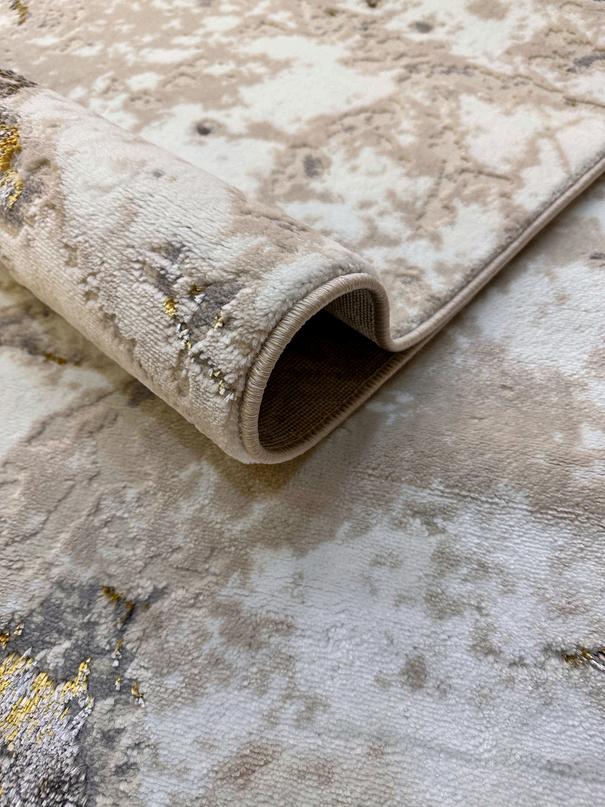 Description/Descripcion Un diseño que mezcla pinceladas suaves con toques dorados como rayos de sol al amanecer. Esta alfombra añade luz y sofisticación a cualquier ambiente, perfecta para destacar espacios con decoración neutra o cálida.