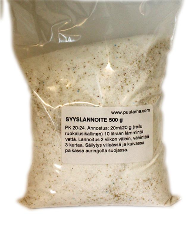 Kastelulannoite, heti kasvien käytössä. Syyslannoite on typetön yleislannoite koko puutarhan syyshuoltoon. PK 20-24. 02-015 Syyslannoite 500 g 5,95 €