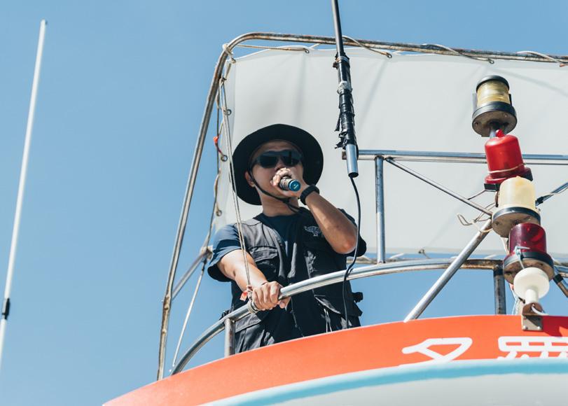 在海上從麥克風傳遞的聲音時而沉穩、時而激昂,那是來自黑潮各形各色 的解說員們。他們可能談起與鯨豚邂逅的趣事、鯨豚的習性,也可能訴說 花蓮的大山大海,或其他舉目所見的光景。今年也辦理解說員的教育訓練