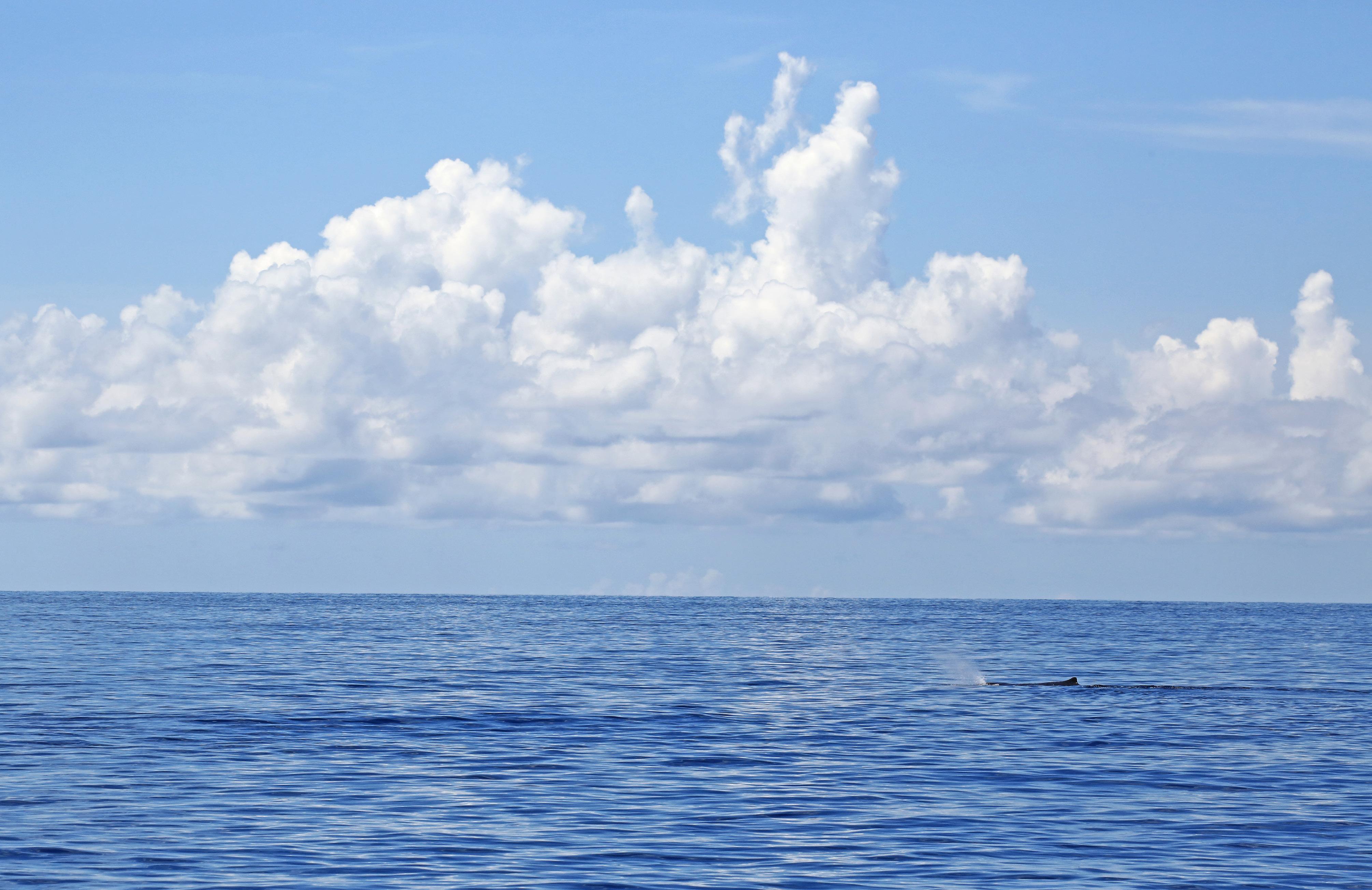 7月,我們在海上遇見親船的抹香鯨小朋友,一下翻身一下浮窺,近到怎麼拍都會超出觀景窗。