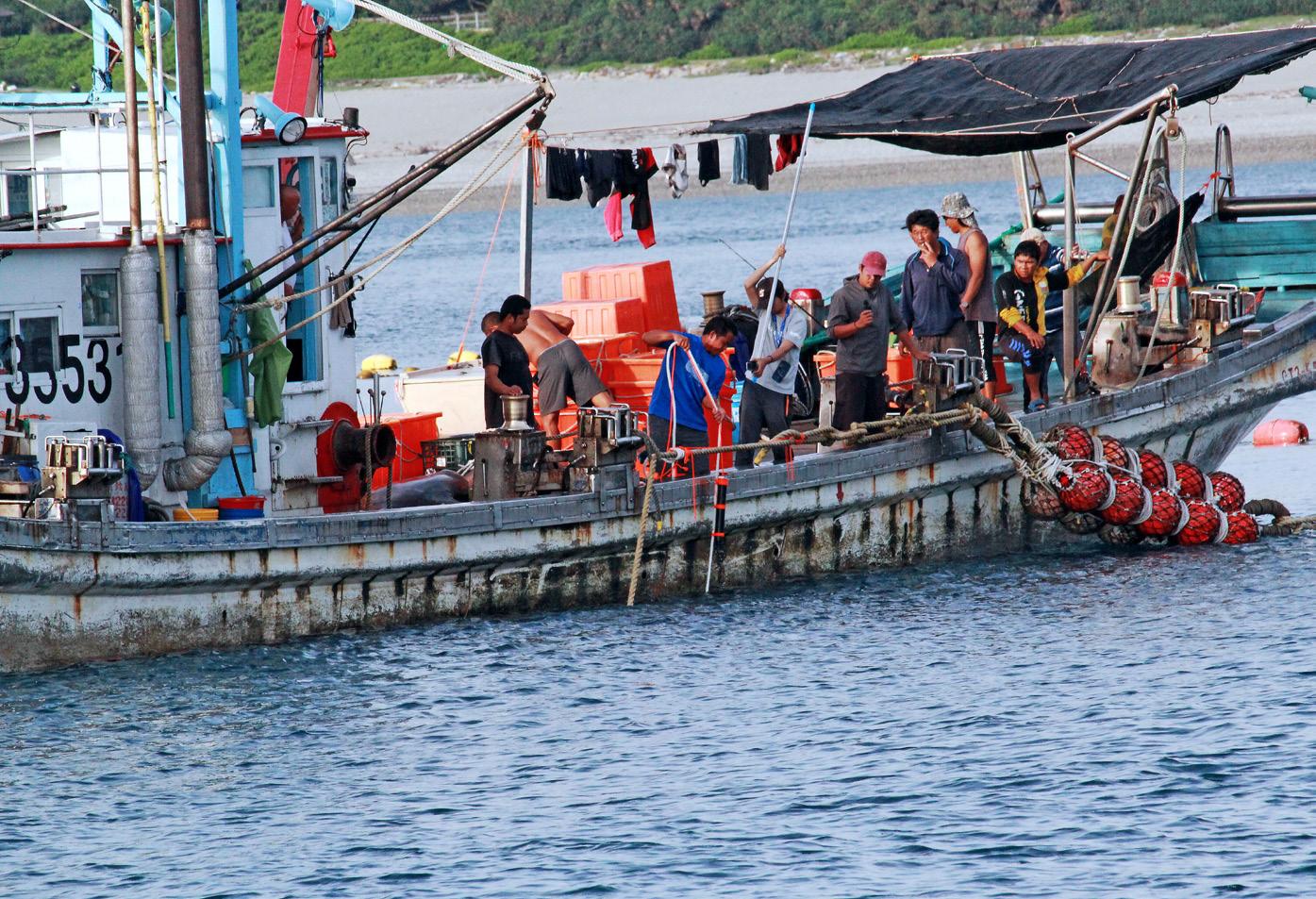 嘉豐定置漁場漁民將水下錄音機綁設於定置漁網