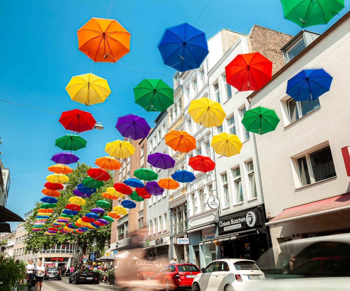 Über den Sommer hinweg spannten sich 300 bunte Regenschirme über die Apostelnstraße, grün, gelb, rot, blau, orange, violett. Die Aktion stammte von der IG Apostelnstraße, einem Zusammenschluss von Händler*innen, Gastronom*innen und anderen Wirtschaftstreibenden vor Ort. Ziel war es, die Aufenthaltsqualität in der Straße sichtbar zu erhöhen – mit fotogenem Effekt in einem Quartier, das im Schatten des Neumarkts mit Problemen wie offenem Drogenkonsum konfrontiert ist. Die Rechnung ging auf: Die Schirme wurden zum Social-Media-Hit, zogen Besucher*innen an und veränderten die Wahrnehmung der Straße. In der Gastronomie vor Ort zeigte sich die Wirkung direkt –bereits ab der ersten Woche stiegen die Umsätze messbar.