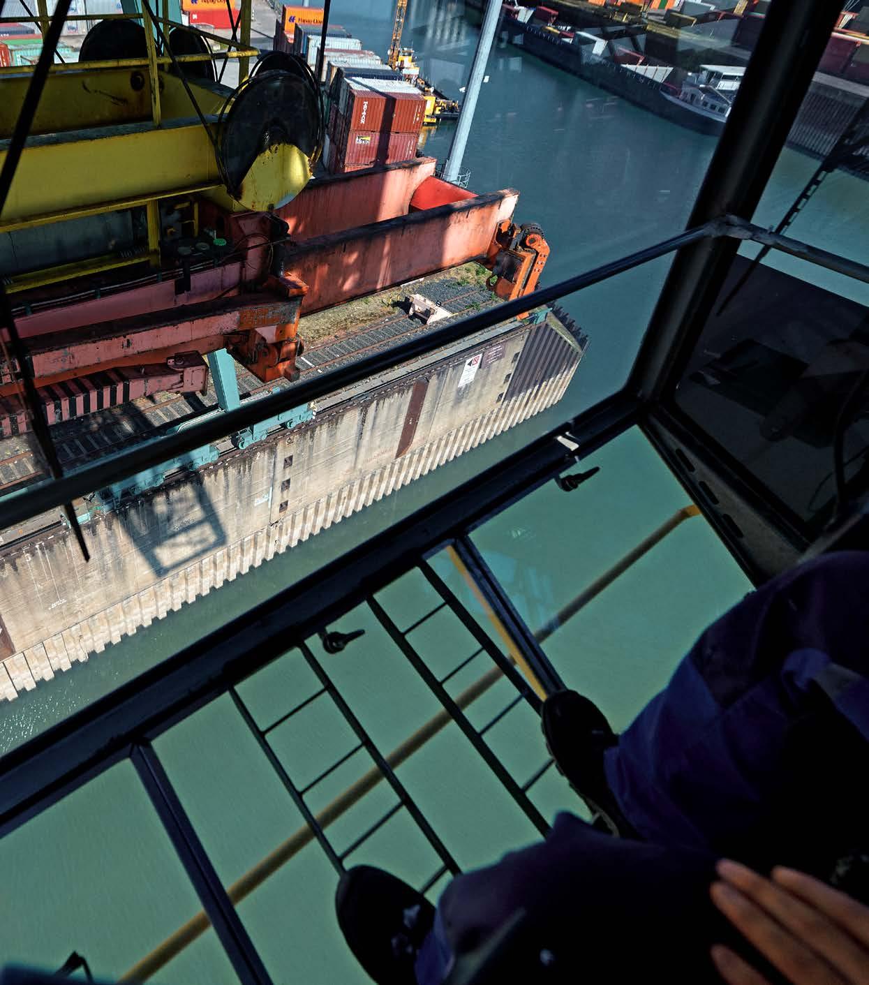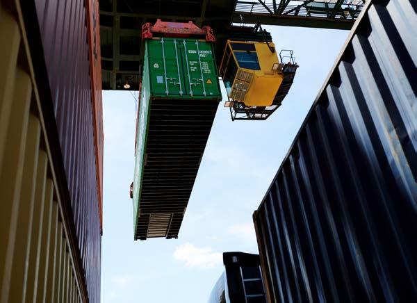 Logistics and Intermodal setzt der Kranführer jede Einheit millimetergenau ab. Allein in 15 Meter Höhe sorgt er dafür, dass der Betrieb reibungslos läuft.