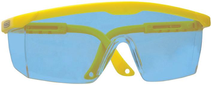 a kék bevonat csökkenti a fényerőt, visszatükröződéseket nem természetes fényforrások esetén polikarbonát lencse - könnyű, karcálló, mechanikai védelem, UV védelem állítható szárak oldalvédelem szemüveg zsinór illesztési lehetőség a szárvégeken