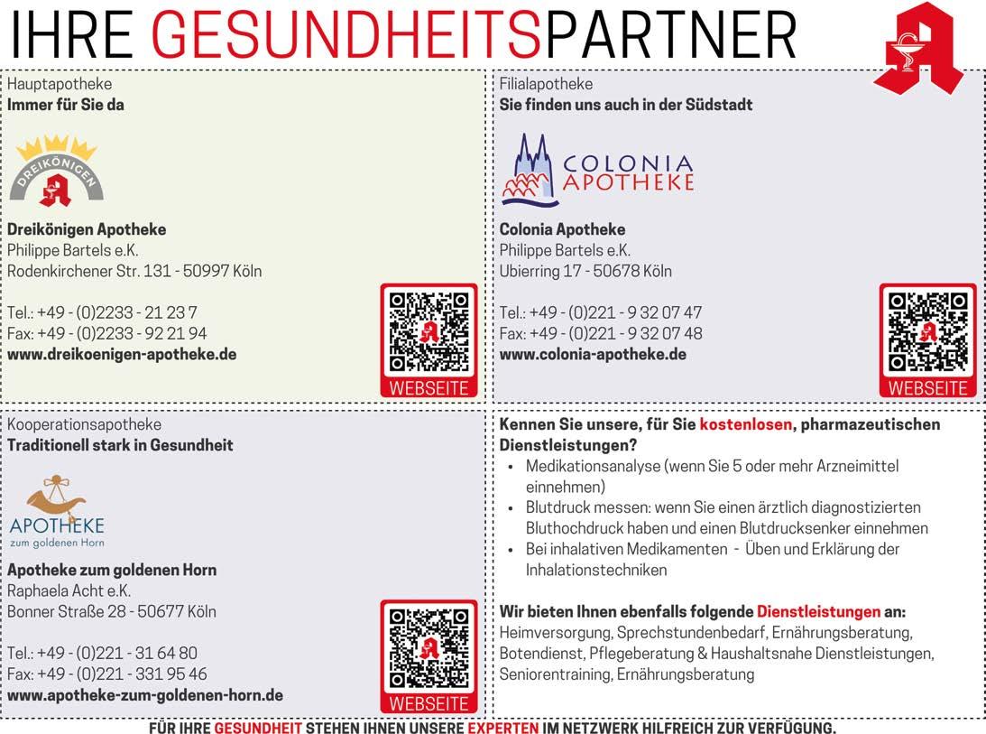 Der „Kölner BilderBogen” wird an Banken, Sparkassen und Einzelhändler verteilt und kann schriftlich beim Verlag bestellt werden. Außerdem liegt unser Heft bei vielen Rodenkirchener Arztpraxen, Friseuren, in Restaurants und Ämtern zum Lesen und Mitnehmen aus. Es gilt die Anzeigenpreisliste Juli 2023. Alle Anzeigen sind urheberrechtlich geschützt und dürfen nur mit Genehmigung des Verlages und gegen Urheberschutzgebühr weiter verwendet werden.