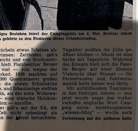 tigen Campingplatz begegnet. Historiker Steckner hatte ja versprochen, „Es ist alles noch da.“ Bleiben wir also gleich mal bei dem Campingplatz. Dieser wurde 1931 gegründet, und zwar von dem Großvater des heutigen Inhabers Bernhard Berger. Recherchen der Familie haben ergeben, dass Großvater Jakob den Campingplatz Anfang der 30er Jahre eingerichtet hat. Er war der erste in ganz Deutschland. Im Jahr 2021 wurde die Anlage 90 Jahre. Das damalige Strandbad lag etwas südlicher und war dort, wo heute die zahlreichen Vereine des Wassersports ihr Geländer haben.