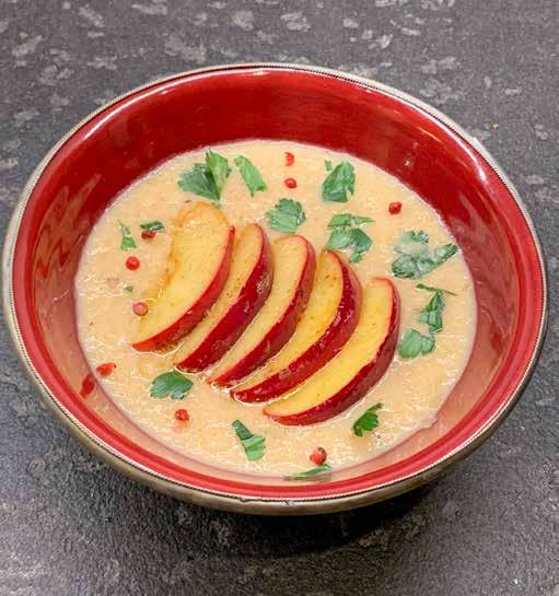 Die Sauerkrautsuppe in Schüsseln füllen, mit Apfelscheiben toppen und mit Petersilie und roten Pfefferblüten bestreuen.