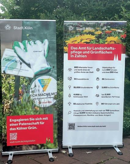 Im Nieselregen hatten die Mitarbeitenden des Amtes im überdachten Bereich des Rheinparks Infostände aufgebaut, wo man sich vom Fachpersonal beraten lassen konnte. In langen Reihen waren gedeckte Tische mit Keksen, Infomaterial und Töpfen mit ausgezeichneten Beetp anzen aufgestellt, an denen sich die rund 150 bis 200 geladenen Gäste austauschen konnten. Bürgermeister Andreas Wolter hielt eine Dankesrede, und im Anschluss sprach Frau Melanie Ihlenfeld, seit Oktober 2024 Leiterin des Grün ächenamtes.
