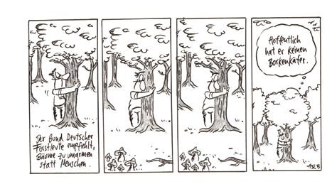Cartoon van Hauck & Bauer: De vereniging van Duitse bosbeheerders raadt aan om bomen te knuffelen in plaats van mensen. “Hopelijk heeft hij geen schorskever”, denkt de boom.