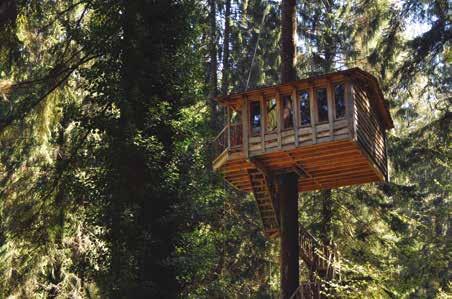 Een boomhut hoog tussen de dikke sparren in het Spaanse Baskenland