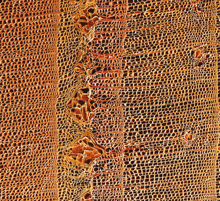 We krijgen een microscopische opname te zien van de doorsnede van een boom. Er zijn twee soorten hout binnen één ring. Er is het vroeghout dat aan het begin van het groeiseizoen wordt gevormd, waarbij de cellen groot zijn. Naar de zomer en herfst toe vormt de boom laathout, waarbij kleinere cellen een dikke celwand vormen. Op het einde van de zomer stopt de boom met het vormen van nieuwe cellen, en de volgende lente begint de cyclus opnieuw.