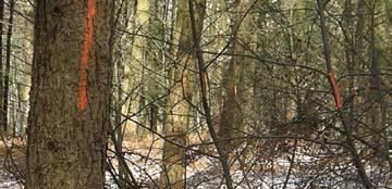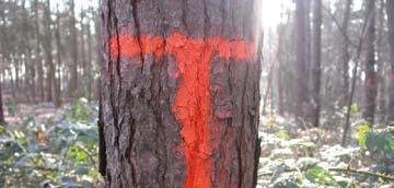 Een dunningsboom wordt best gemarkeerd met 2 schuine verfstrepen, zodat de boom van elke kant zichtbaar is.