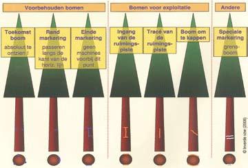 Overzicht van de betekenis van verfmarkeringen die bij bosexploitatie gebruikt worden.