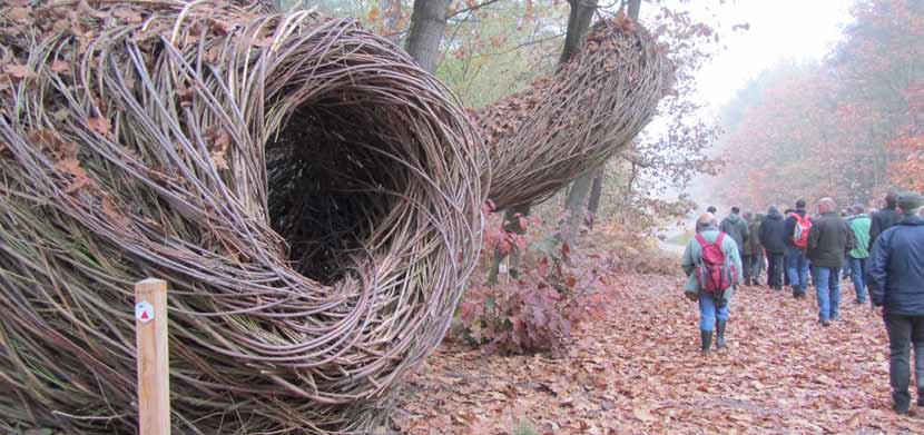 Het terrein op. Opvallend zijn de Amerikaanse eiken die hier zeer talrijk aanwezig zijn. “We laten hen hier naast de wandelweg staan, want wandelaars en onze recreanten genieten van de mooie herfstkleuren”, zegt de boswachter. “Je kan hier honderden kilometers fietsen, paardrijden, mountainbiken en er zijn heel grote speelzones, waar kinderen –zoals vroeger – in het bos kunnen ravotten en kampen bouwen”. Zelfs kunst ontbreekt niet; een wilgensculptuur suggereert een nest. Een heuse boomhut op metalen stutten doet