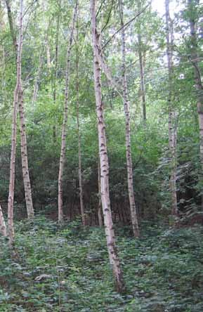 Deze berken zijn dringend aan een dunning toe. Merk op dat onder deze lichtboomsoort bramen goed kunnen groeien.