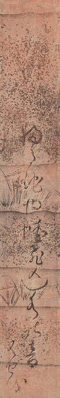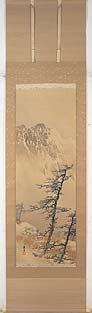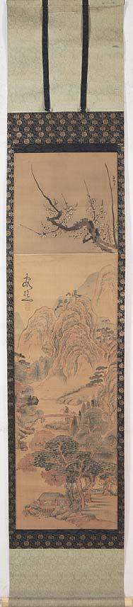 付時代溜塗識箱(桐・虫喰 貼札) 紙本 牙軸端 41×88 表具51×172 ヤケ シミ スレ オレ 表具シミ 秋月は諱を等観、俗姓を高城氏、もと薩摩島津氏の家臣。雪舟の弟子 の中では最もその画風を受けつぎ著名である。明応五年(1496)遣明使 に同行し渡明、晩年は薩摩に帰り数人の画の弟子を育てたことが知られ ている。 周耕は和州多武峰に住した僧で、雪舟に学び、雪舟とともに入明したと記す画伝がある。作風からみた周耕は雪舟弟子とするに相応しいが、現存する作 品が少なく、伝歴はまだ不明の部分が多い。