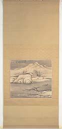 付時代識箱(桐 貼札・身桟破損) 紙本 牙軸端 33×22 表具44×98 薄シミ スレ 表具オレ、スレ 相阿弥(生年未詳~大永五・1525)は芸阿弥の子、能阿弥の孫。足利義 政の同朋衆。名は眞相、別に松雪斎、鑑岳と號す。父に画を習い、周文、 牧溪の画を慕った。また詩画や茶道にも造詣が深く、鑑識に精通してい た。阿弥派の集大成というべき『君台観左右帳記』『御飾記』を完成させ、 伝承作品は多いが実体は不明な点が少なくない。