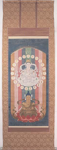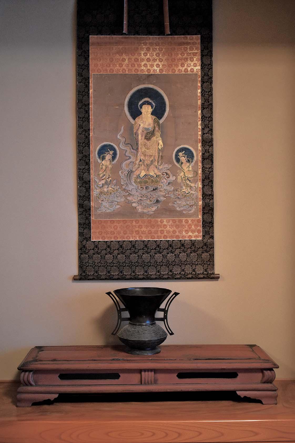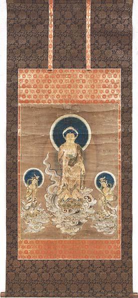 #044 阿弥陀三尊来迎画幅 ¥150,000~ 付木箱(桐 貼札) 紙本 金軸端 58×81 表具75×175