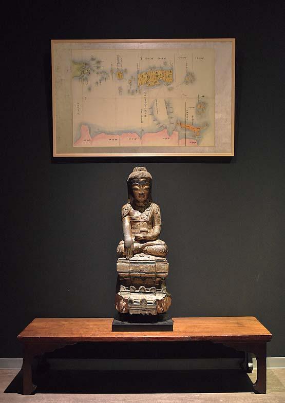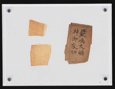 #054 八臂辨財天坐像画幅 ¥300,000~ 付時代識箱(桐) 絹本 朱塗軸端 42×87 表具56×160 ヤケ スレ #055 竹生島飾 ¥30,000~ 付版本竹生島伽藍再建棟札表面文書幅 17×17×12 #056 黒漆塗前机 ¥30000~ 63×31×28 メクレ