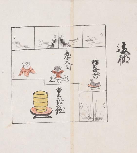 夫々に、「食器」「香具」「茶器」「花器」「音具」の諸具が適宜に配された。夫々に「真」「草」「行」の次第が練られ、同時に四 季の移ろい、さらに年中行事である月次行事の数々も意識され、これらを素材として室礼(床の間を飾る文化 )が模索され探求さ れつづけた。加え、この所作には、消え去るものを愛おしむ心配りが留意された。それらが秘伝、口伝の子細である。