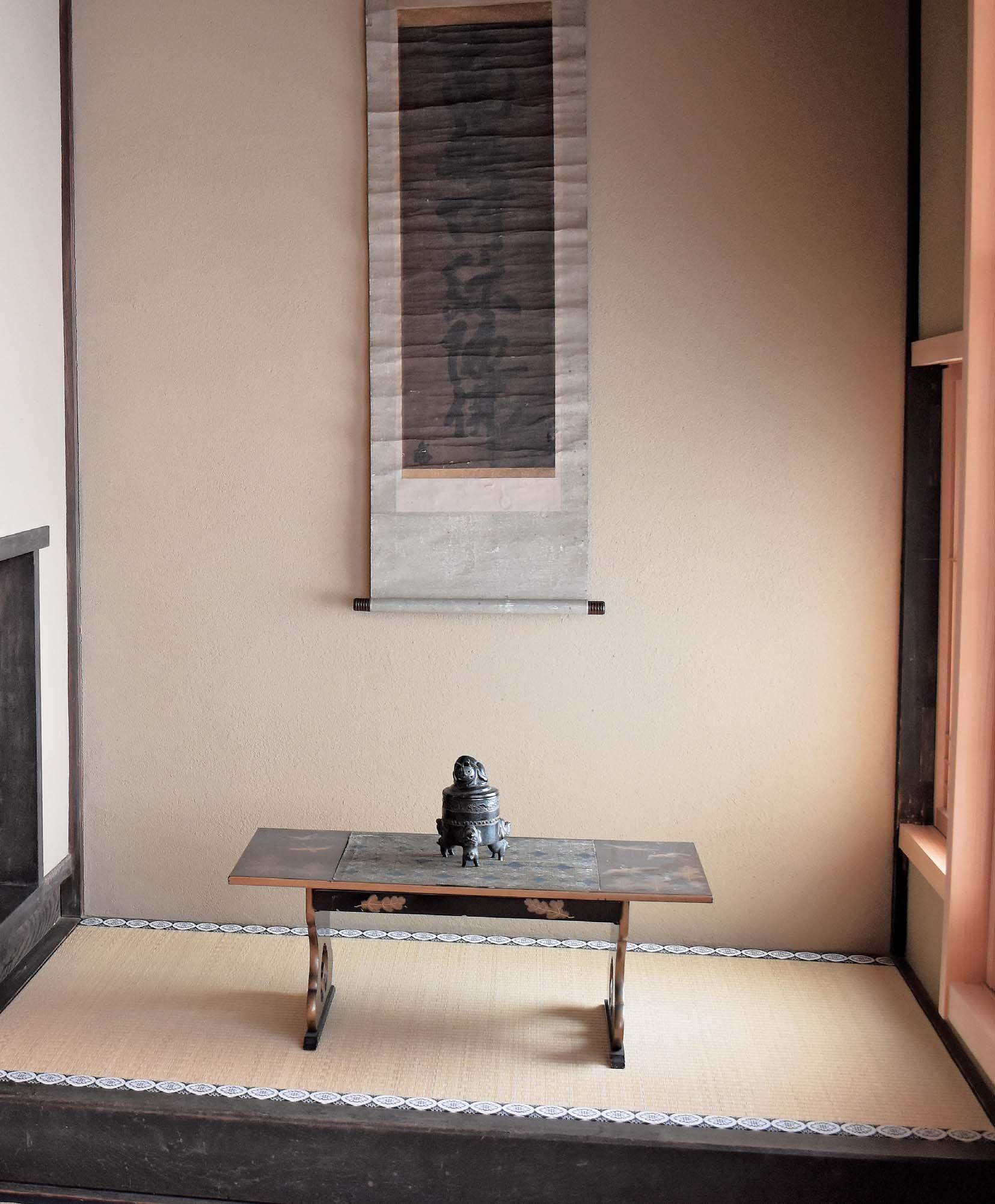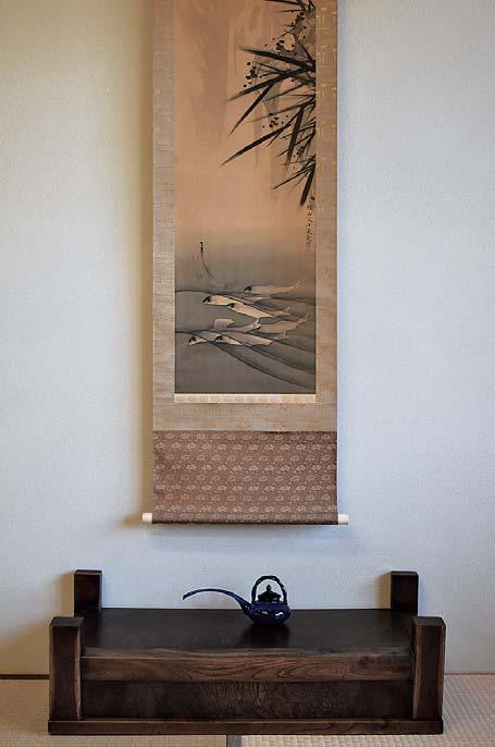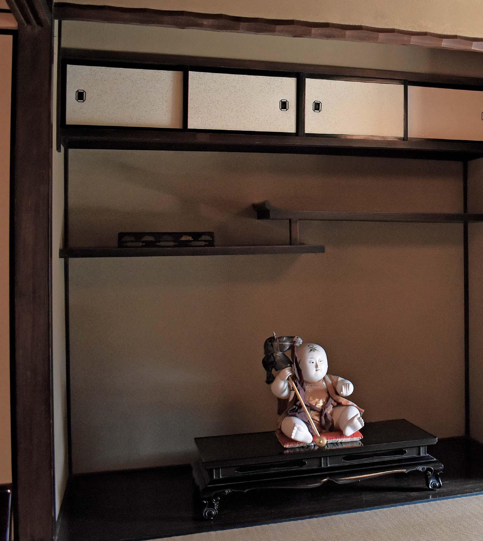 床の間は、この三つの機能を一体化したものであり、これの荘厳は「掛物」を第一とし、「書院」は文字文化への感謝を象徴し、 違い棚には、珍奇珍物への関心が反映された。