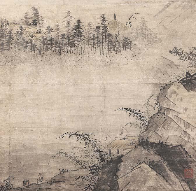 #031 秋月等観 山水画大幅 ¥150,000~ 付時代箱(桐) 紙本 三ツ葉葵紋蒔絵軸端 75×74 表具87×161 ヤケ シミ オレ 表具スレ 秋月は諱を等観、俗姓を高城氏、もと薩摩島津氏の家臣。雪舟の弟子の中では最もその画風を受けつぎ著名である。