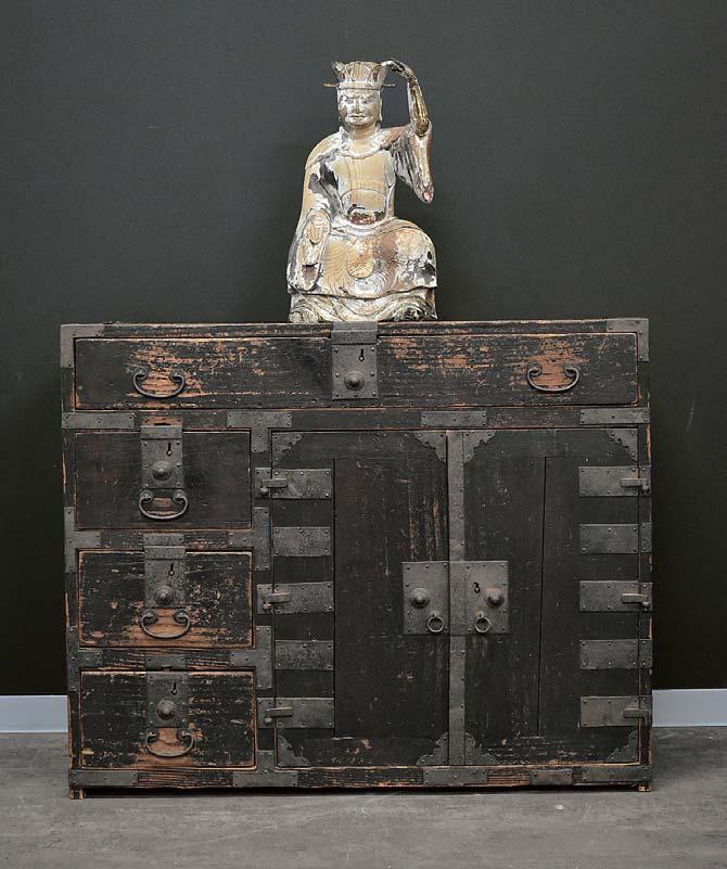 #048 不動明王二脇侍画幅 ¥250000~ 絹本 金軸端 39×100 表具53×172 ヤケ シミ 表具大アレ、虫喰 「阿遮羅尊 東寺佛来院」巻止識 #049 経蔵形厨子 ¥100000~ 29×29×69 塗補修 内箔押 三宝扉 #050 猫脚礼盤 ¥70000~ 63×63×16 ヒビ スレ アタリ