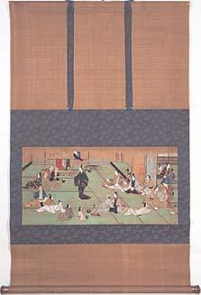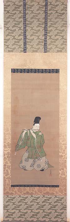 付時代識箱(桐) 紙本 唐木軸端 54×124 表具58×199 キレ 虫穴 弘仁十一年(820)の嵯峨天皇から弘化四年(1847)の孝明天皇まで、天 皇は唐国皇帝の朝服に倣った礼服(袞冕十二章)を被着して即位式に臨ん だ。この唐風は明治に廃されて以降は現行の束帯式になるが、明治以前の 天皇の礼服姿の描出は極めて貴重である。筆者である吉田元陳の歿年(寛 政七・1795)をもとに勘案すれば、掲出は光格天皇尊影の可能性が高い。な お、上辺の紺地白抜丸文は、高御座正面の三鏡を意識したものとみられる。