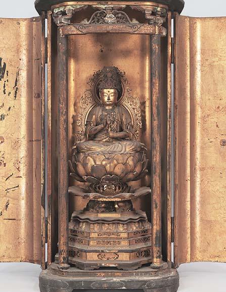 A-016 竹内久一 木彫千体天神 二 ¥80,000~ 付厨子(23×23×26) 像高11ほか 顔損傷 一方に「国定教科書共同販売所之属大正三年(1914)十月帝室技芸員正五位勲五等竹内久一刻」の墨 書、一方に「久一」の彫銘をみる。『春城師友録』によると、帝室技芸員である竹内久一が菅公千年忌 (1902)に際し菅公像一千体を制作したとあり、掲出は内の二体となろう。梅鉢紋扉金具を配した天神 厨子付属。