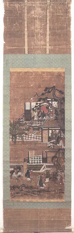 KR-003 英一蜂 南柯夢画幅 ¥300,000~ 付時代箱(桐 貼札) 絹本 唐木軸端 69×40 表具83×127 ヤケ スレ 英一蜂(元禄四・1691~宝暦十・1760)は英一蝶の門人。江戸の人。別号一嶂、春窓翁、春窓斎。作品に『画本図編』、小川破笠との合作で手掛けた初代 市川団十郎二十七回忌追善句集『父の恩』をのこす。