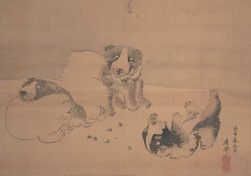CN-149 孫菊生 双猫画幅 ¥100000~ 付木箱(桐) 紙本 陶磁軸端 33×135 表具44×191 シミ オレ 表具オレ 孫菊生(1913~2018)は北京の画家。字は暁湖、浙江省余姚市の生まれ。特に猫の絵を能く し、「猫王」とも称される。