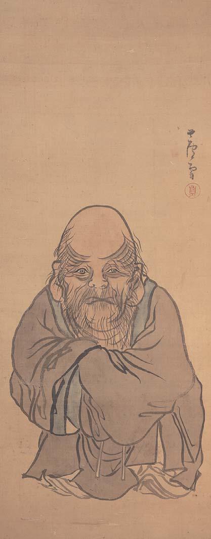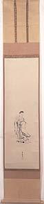 A-032 大心義統 柿本人麻呂画賛幅 ¥50000~ 付木箱(桐 貼札) 紙本 雑木軸端 26×65 表具28×128 ヤケ シミ オレ 表具オレ、シミ 大心義統(明暦三・1657~享保十 五・1730)は大徳寺二百七十三世。 天倫宗忽の法嗣で、宝永三年 (1706)に奉勅入寺。号を蓮華童子、 巨妙子、金剛童などとした。